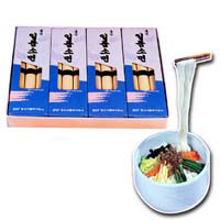 Ilpum Somyeon, made from non-bleaching flour, is receiving recognition as the finest noodles in the country. Ilpum Somyeon produced with good raw material and all kinds of devotion also conducts the pursuit of differentiation from general products and is suitable for present use. This products is smooth and sticky by virtue of strengthening the gluten formation of wheat flour and maturing noodle with adequate temperature in the course of kneading dough. There may be some differences in the color of Nokcha Somyeon on account of climatic conditions during the process of production but nothing is wrong with the quality.